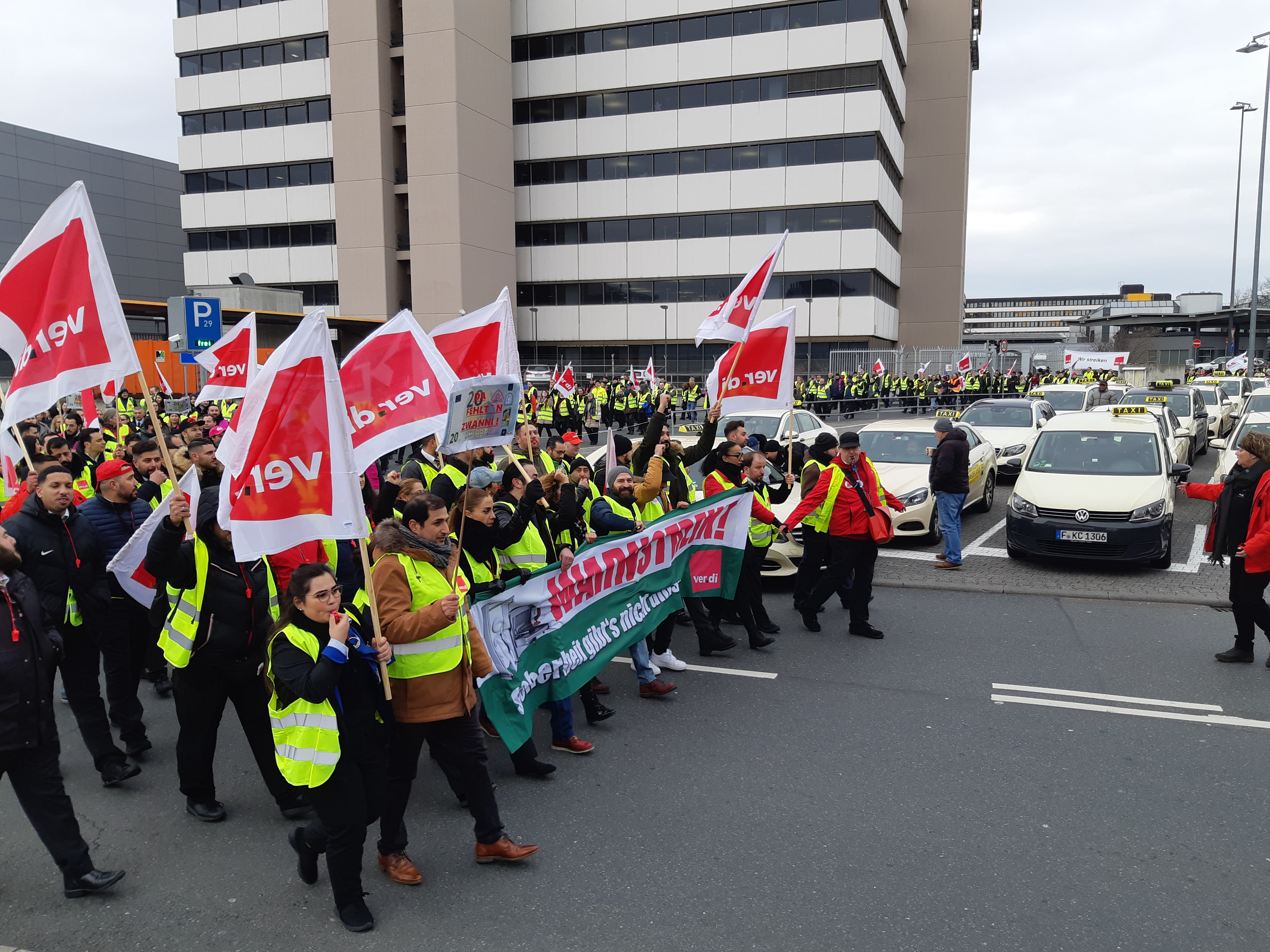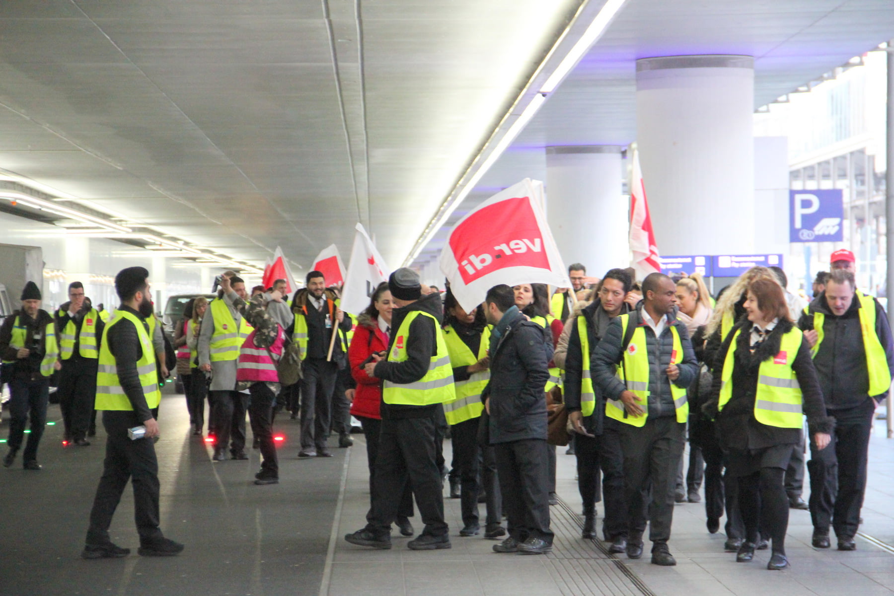 Ab 1 Uhr waren wir vor Ort. Wir, das waren die Streikleitung, Gewerkschaftssekretäre, Vertrauensleute und Betriebsräte der Firmen FraSec, I‑SEC, ICTS und POND. Streikposten besetzen wichtige Punkte, und es geht los. Jede S‑Bahn wurde in Empfang genommen, an den Parkhäusern und Bushaltestellen sind ebenfalls Kolleg*innen vor Ort. Die ver.di-Streik-Westen wurden uns nur so aus den Händen gerissen. Zwei Gewerkschaftssekretär*innen, die sich normalerweise um den Einzelhandel und die Sparkassen kümmern, halten mit Kollegen der I‑SEC die Stellung im T2.