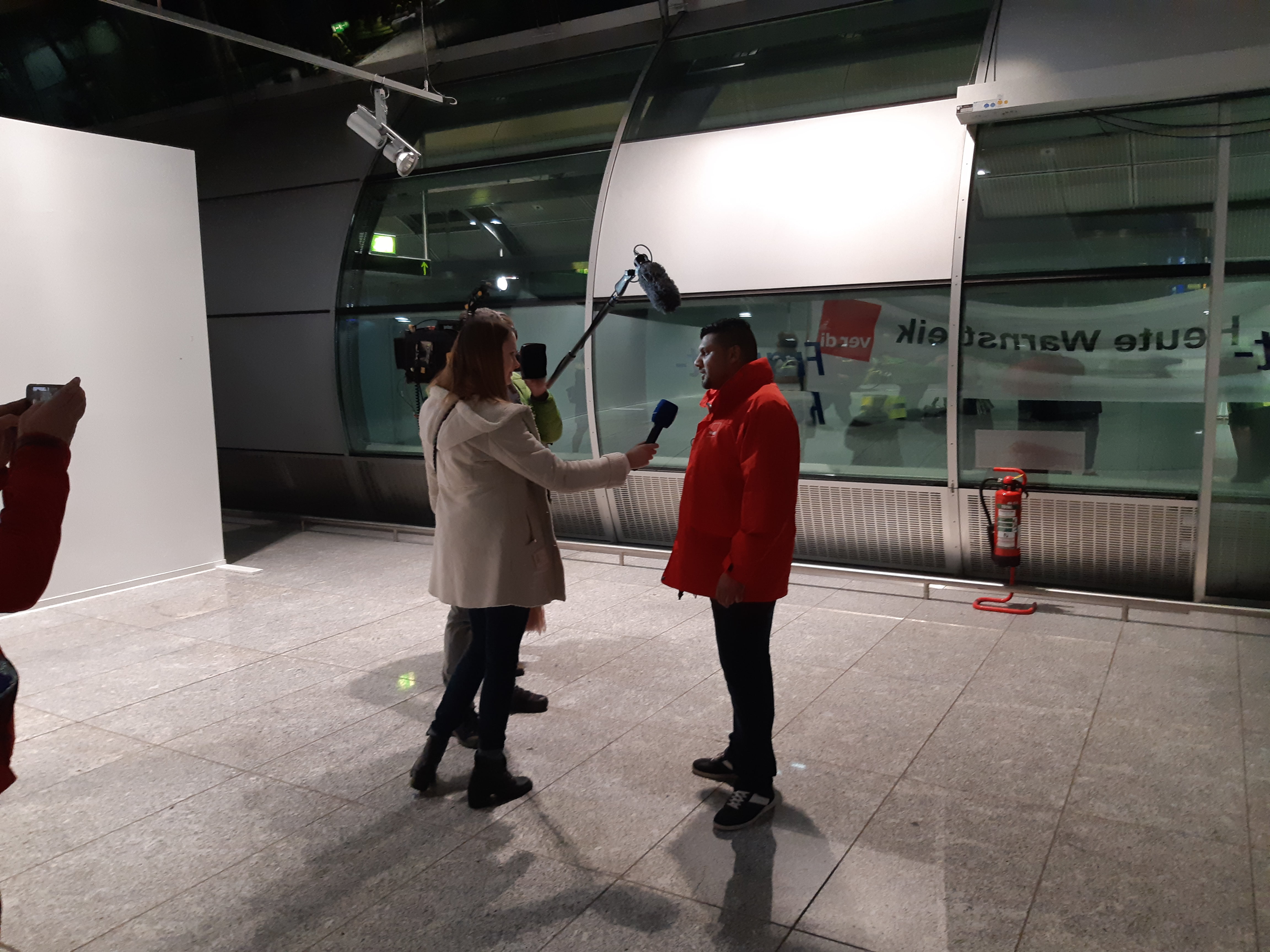 Ebenfalls anwesend und seit dem frühen Morgen vor Ort ist die Presse. ARD, RTL, dpa, RPR1, alle reißen sich um Statements. Unser Landesfachbereichsleiter Mathias Venema und Benjamin sind besonders gefragt. Natürlich wollen die Medien auch mit Betroffenen sprechen. Kollegen geben spontan tolle Interviews, einige landen dann auch in der Tagesschau. Natürlich kriegen wir per Internet mit, dass auch die anderen zum Streik aufgerufenen Flughäfen dabei sind. Hannover, Bremen, Erfurt, Leipzig, Dresden, München, Hamburg. Überall stehen die Kollegen auf für höhere Löhne. Doch die überregionalen Medien konzentrieren sich auf den größten Flughafen – auf Frankfurt und damit auf uns.