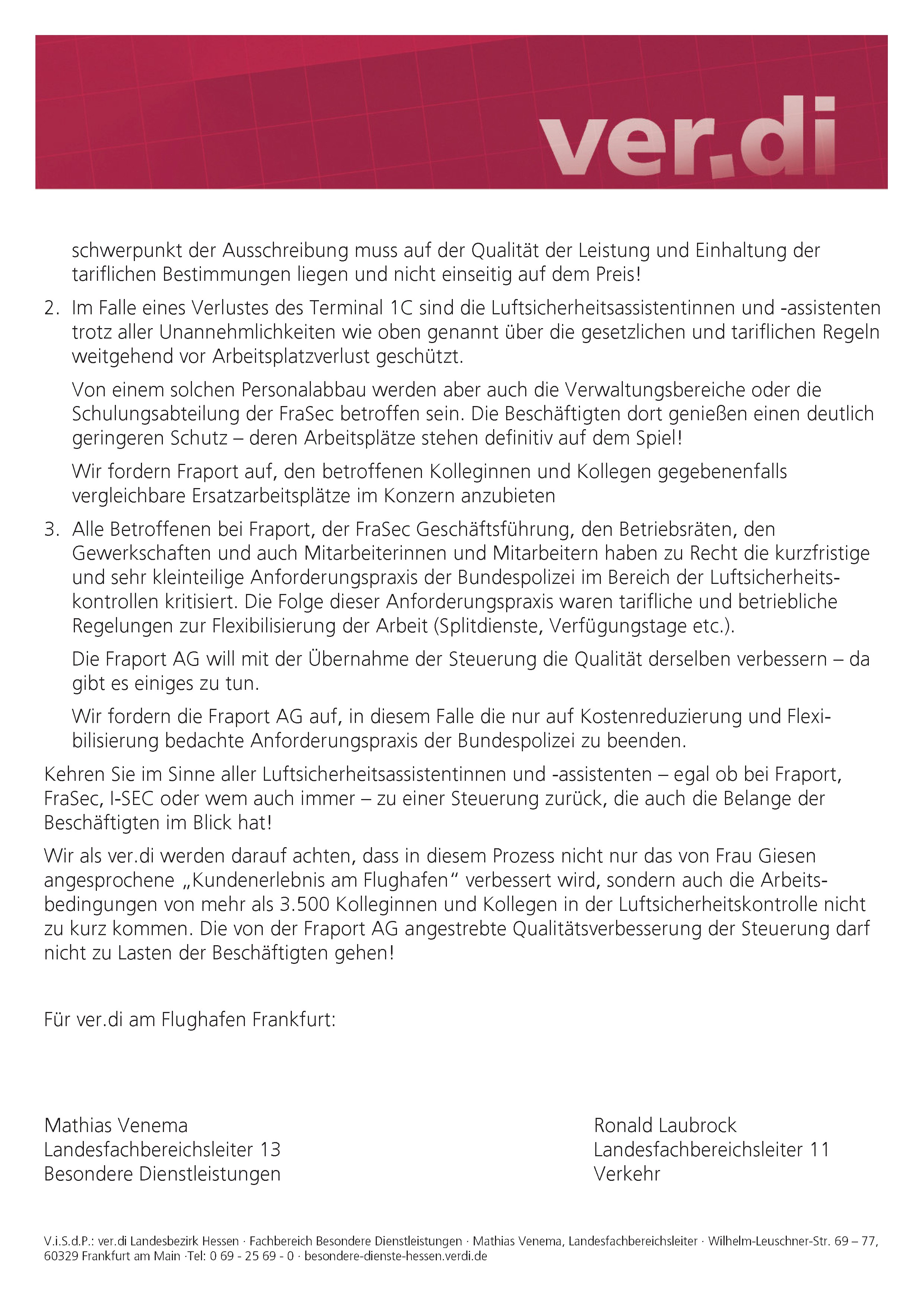 Wir als ver.di werden darauf achten, dass in diesem Prozess nicht nur das von Frau Giesen angesprochene „Kundenerlebnis am Flughafen“ verbessert wird, sondern auch die Arbeitsbedingungen von mehr als 3.500 Kolleginnen und Kollegen in der Luftsicherheitskontrolle nicht zu kurz kommen. Die von der Fraport AG angestrebte Qualitätsverbesserung der Steuerung darf nicht zu Lasten der Beschäftigten gehen!